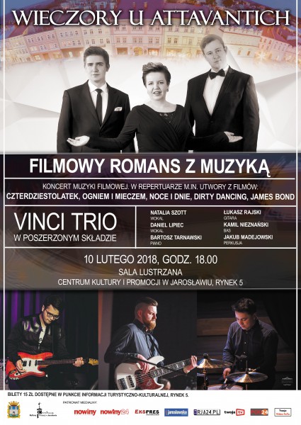 Już 10 lutego zapraszamy wszystkich do Sali Lustrzanej na „Filmowy romans z muzyką”. Koncert muzyki filmowej wykona Vinci Trio, tym razem w poszerzonym składzie.