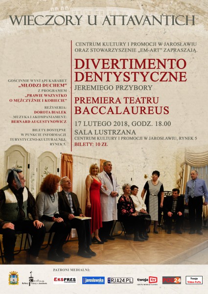 Już 17 lutego w Centrum Kultury i Promocji odbędzie się premiera Teatru Baccalaureus, działającego przy Stowarzyszeniu „EM-ART”. Przedstawieniu Jeremiego Przybory „Divertimento dentystyczne” będzie towarzyszył gościnny występ kabaretu „Młodzi Duchem” z programem „Prawie wszystko o mężczyźnie i kobiecie”.