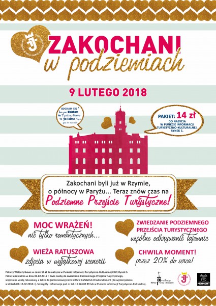 Pakiet upoważnia w dniu 09.02.2018 r. dwie osoby do zwiedzania Podziemnego Przejścia Turystycznego, wejścia na wieżę ratuszową, a także do jednorazowej zniżki 20% w Cafe&Pub Chwila Moment (do wykorzystania w dniach 09–13.02.2018 r.). Szczegóły i informacje pod nr tel. 16 624 89 89 lub w Punkcie Informacji Turystyczno-Kulturalnej.